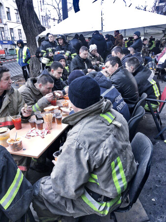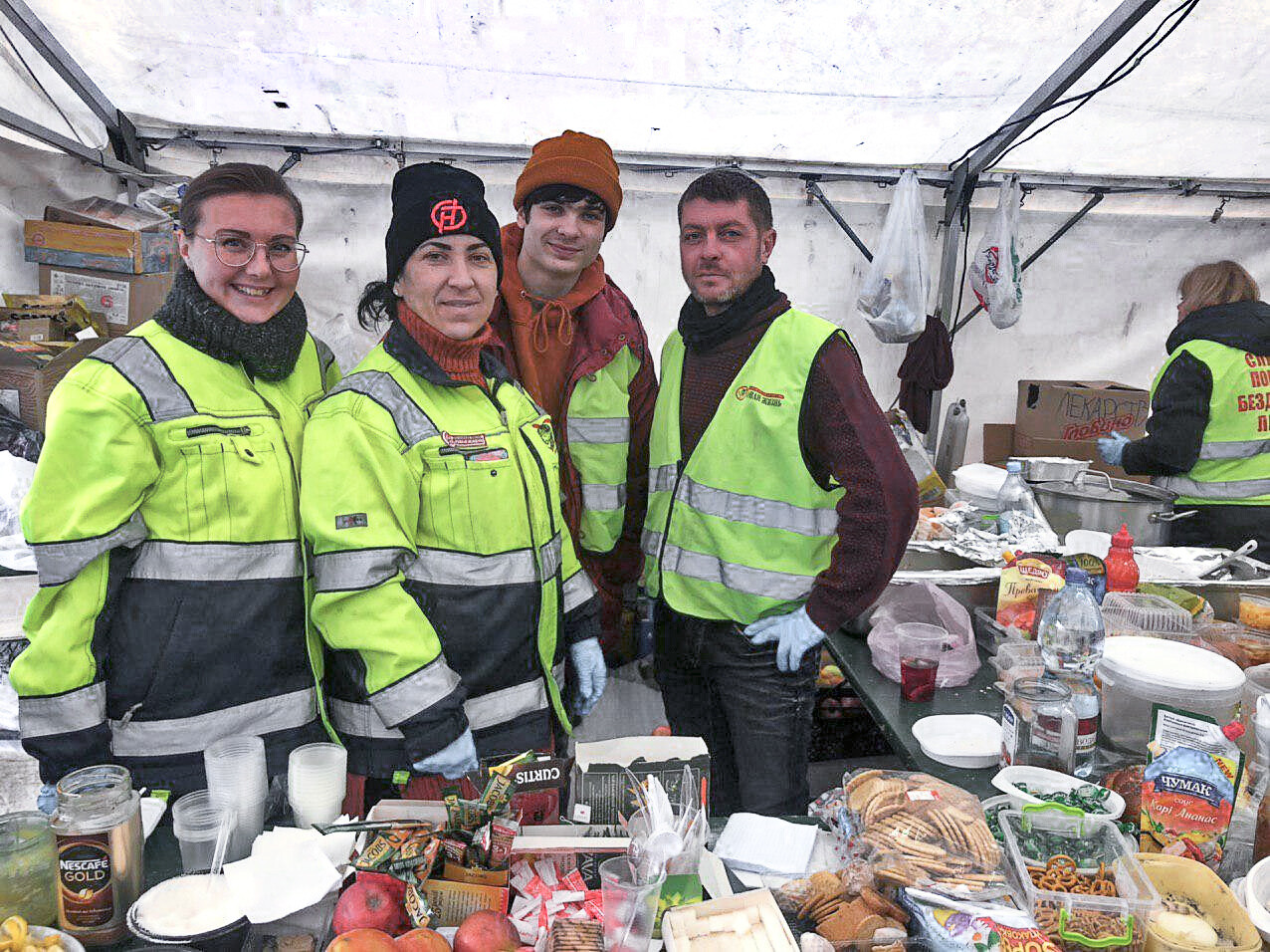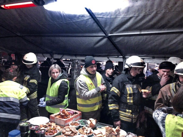 The Red Cross Rapid Response Unit organized the work and was on duty for the first 60 hours, after which they passed the baton to us. Our volunteers provide the work of the dining room and the heating point for rescuers who remove the rubble and for relatives of missing children.