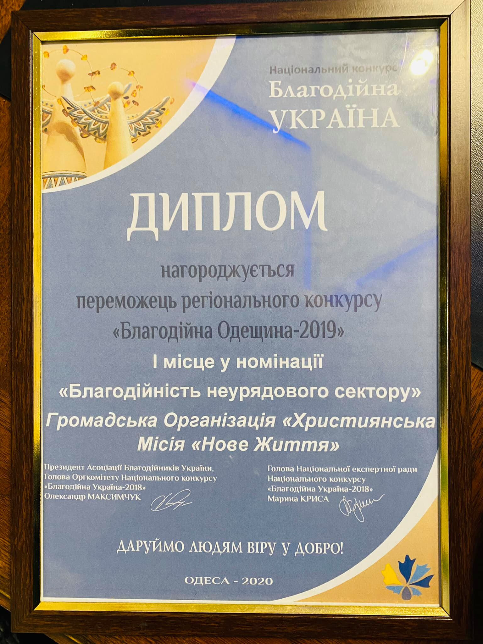 Нещодавно Християнська Місія «Нове Життя» отримала нагороду в регіональному конкурсі «Благодійна Одещина-2019» у номінації «Благодійність неурядового сектору».