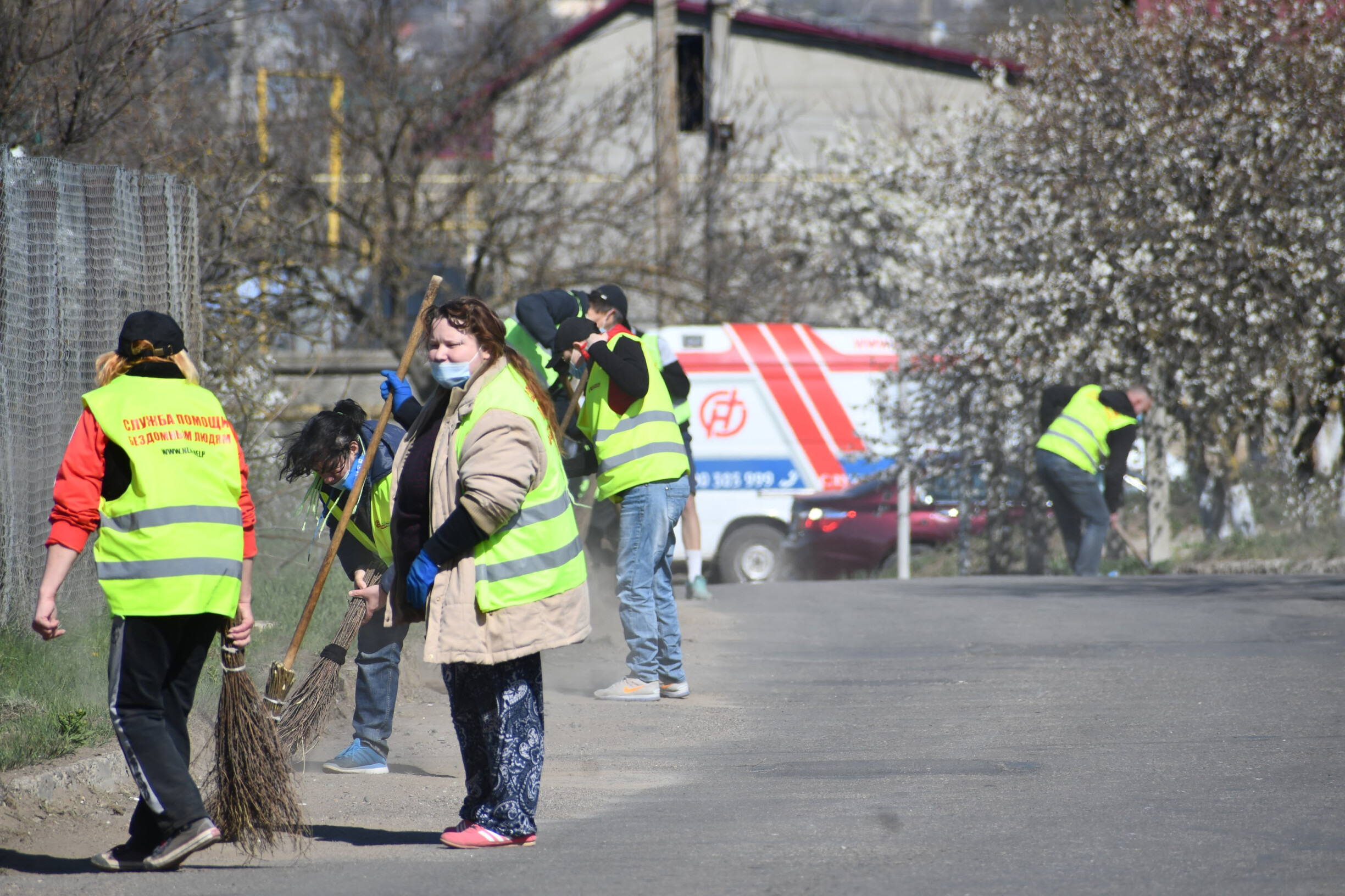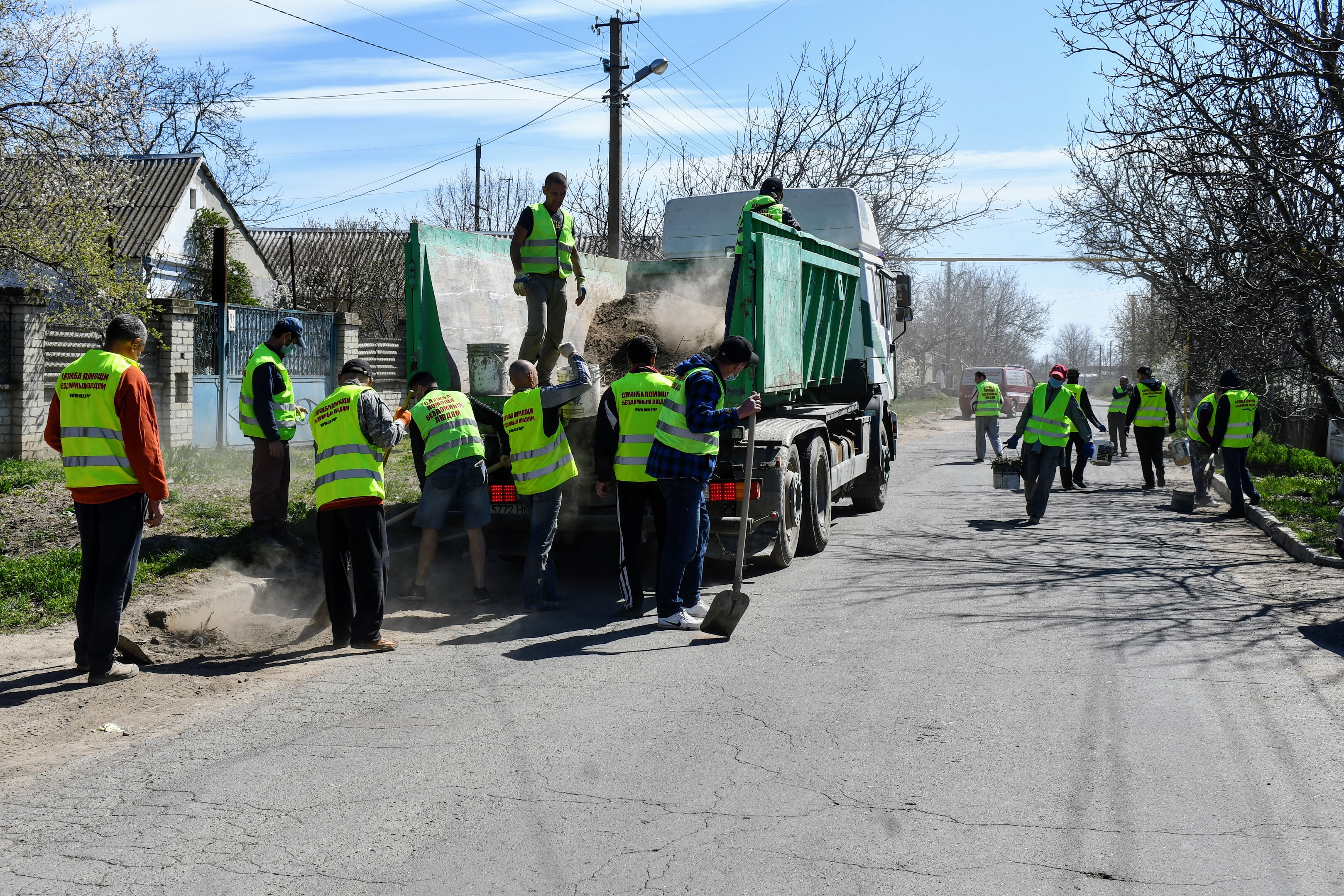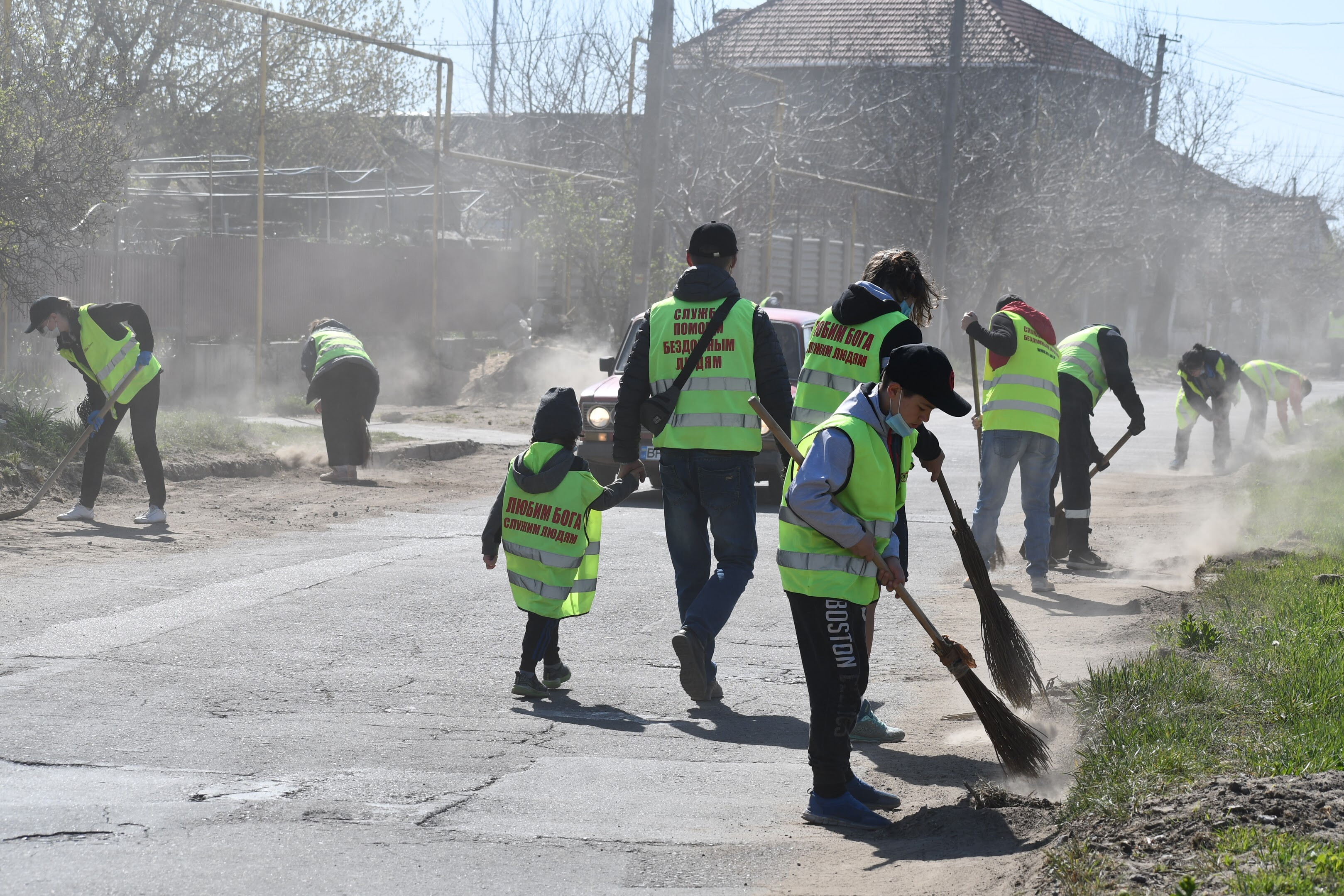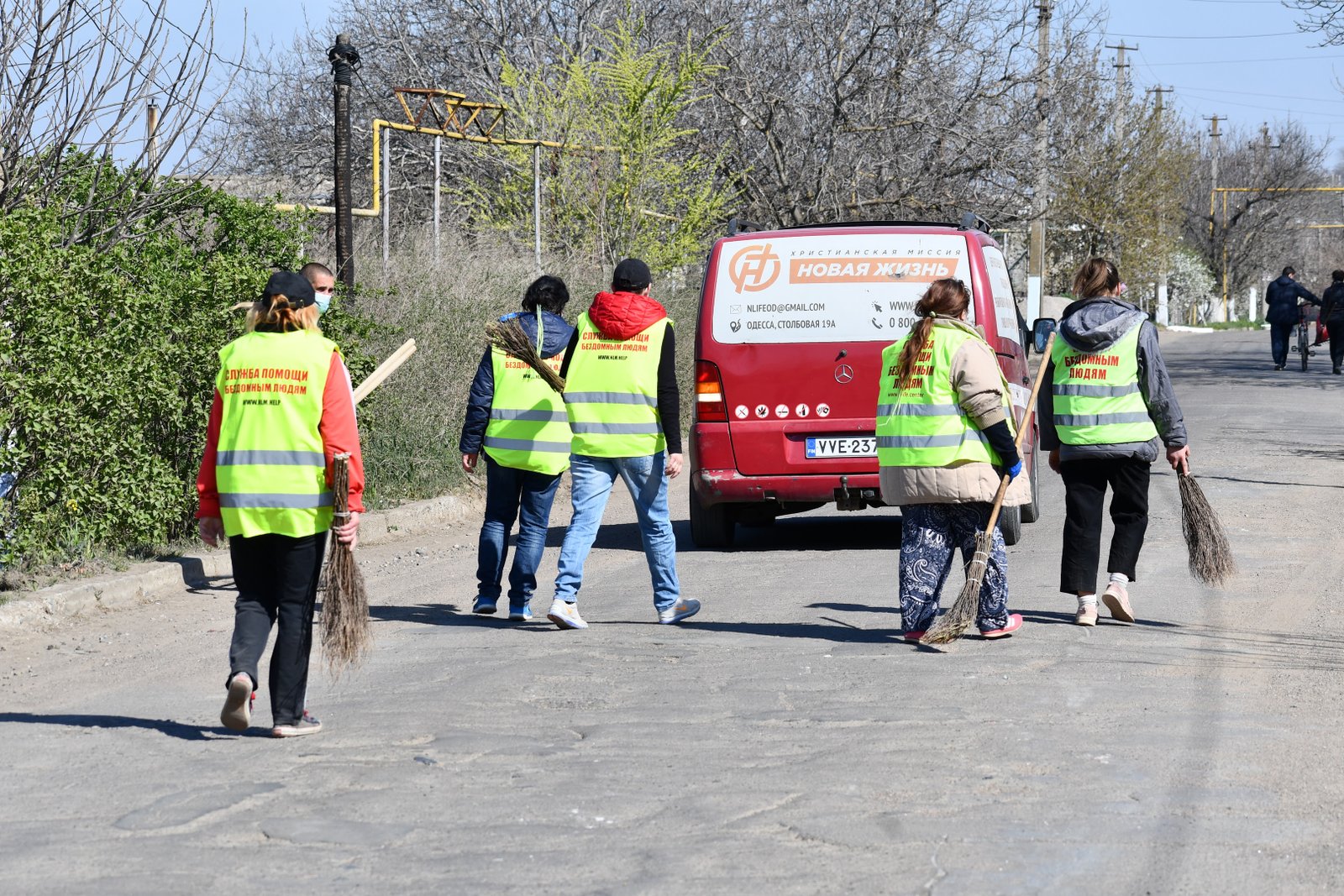 Сьогодні вихованці Християнської Місії «Нове Життя», які раніше були бездомними, провели суботник у смт. Великий Дальник, Одеська область. Близько сорока людей прибирали вулицю, де розташований один із центрів Місії: чистили газони, бордюри, збирали сміття.